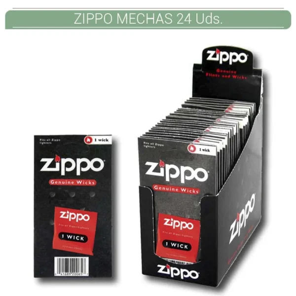 Mechas Zippo originales para mechero. Las mechas Zippo, con el tiempo, se volverán negra debido a la acumulación de carbono, lo que reducirá el rendimiento del mechero Zippo. Cuando esto suceda, hay que recortar la mecha. Expositor de 24 unidades. COD. ART. ZIPOTR1000
