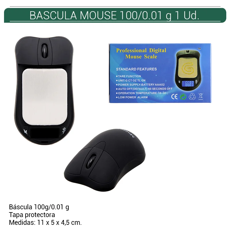 Báscula ATOMIC Mouse Negra es una herramienta de precisión para pesar con exactitud objetos de hasta 100 gramos con una precisión de 0.01 gramos. Su diseño compacto y ergonómico la hace ideal para entornos comerciales. Equipada con tecnología avanzada, pantalla LCD y función de tara. Funciona con una sola pila AAA (no incluida) para mayor comodidad. COD. ART. FUMOTR1717