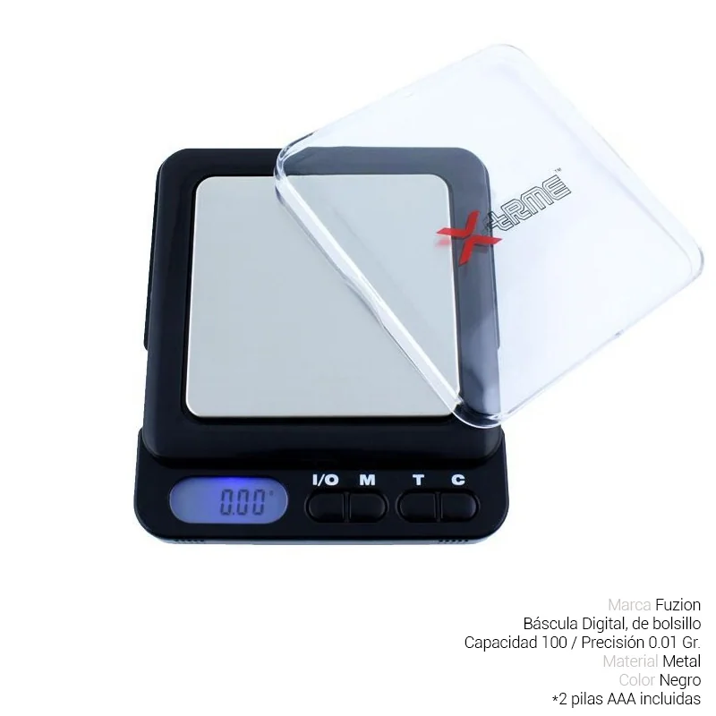Báscula de precisión FUZION XTR 0.01/100 gramos, Con capacidad máxima de 100 gramos y precisión de 0.01 gramos, facilita la pesada de productos pequeños. Diseño en color negro, elegante y discreto. Incluye función de tara y pantalla LCD retroiluminada para una lectura clara. Compacta y fácil de transportar. Práctica y precisa para el control de inventario y ventas. COD. ART. FUMOTR1733