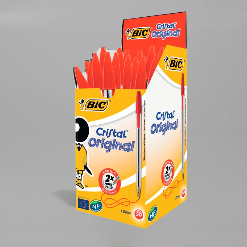 El clásico BIC Cristal Original con cuerpo transparente es el bolígrafo más vendido del mundo. Esta caja contiene 50 unidades con tinta roja. Cada uno de estos bolígrafos de escasísimo peso puede escribir una media de 3 km, y cuenta con la etiqueta de certificación ecológica NF Environnement. El diseño minimalista de este mítico objeto ha llegado incluso a incorporarse a la colección permanente del Museo de Arte Moderno de Nueva York (MoMA) y el Centro Pompidou de París. COD. ART. BICOTR1002