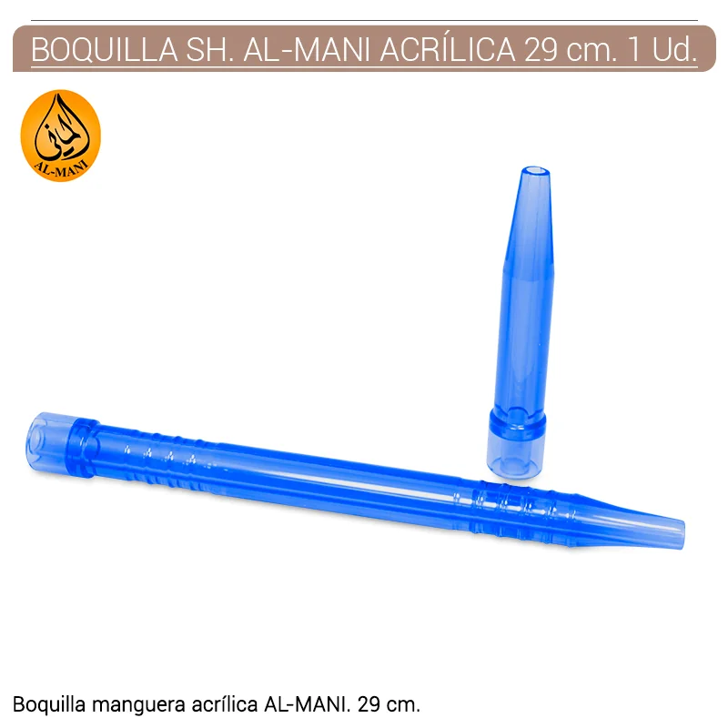 Producto de alta calidad, fabricado en acrílico con forma recta en color azul. Tiene un longitud de 29 cm y adaptador, lo que permite una fácil inserción en la manguera de la shisha. La boquilla está hecha en material acrílico, lo que la hace resistente a la corrosión y al desgaste. COD. ART. SISACC3112
