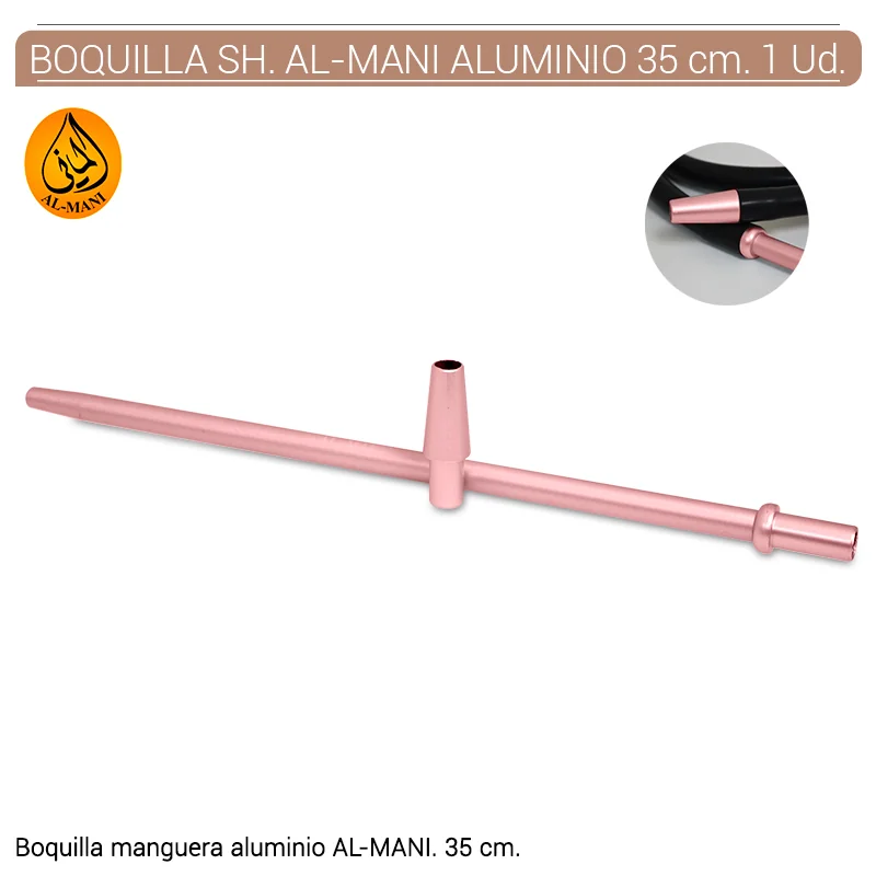 Producto de alta calidad, fabricado con materiales resistentes y duraderos. Está diseñada con forma recta de aluminio en color rosa, lo que la hace atractiva y fácil de identificar. Tiene un longitud de 35 cm y adaptador, lo que permite una fácil inserción en la manguera de la shisha. La boquilla está hecha de aluminio, lo que la hace resistente a la corrosión y al desgaste. Además, su diseño en espiral permite una distribución uniforme del humo, lo que mejora la experiencia de fumar. COD. ART. SISACC3103