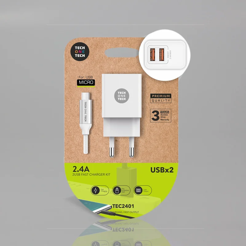 CARGADOR DOBLE BLANCO+CABLE NYLON Micro USB 2,4A 1 Ud.TEC2401