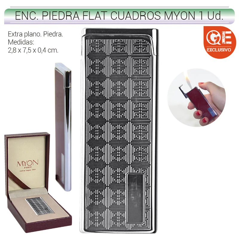 MYON Encendedor Ultra Flat de llama Turbo. Diseño delgado y compacto en cuadros. Combina estilo y funcionalidad para una experiencia de encendido conveniente. Ideal para llevar en el bolsillo o bolso. Perfecto para quienes buscan un encendedor práctico y elegante. Incluye caja para regalo. COD. ART. MYOENC1009