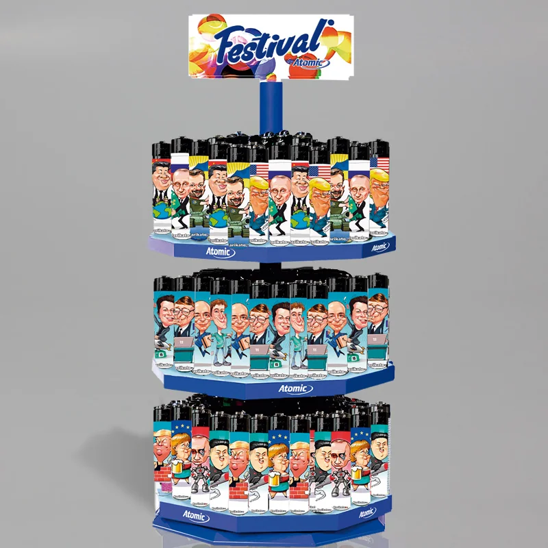 El encendedor Atomic Festival 2.0 Piedra es una opción práctica y confiable para quienes necesitan una chispa rápida y segura. Este expositor carrusel incluye 144 encendedores con diseño colorido y con diveridas caricaturas de los auténticos jefazos del mundo. COD.ART.ATODEC1523
