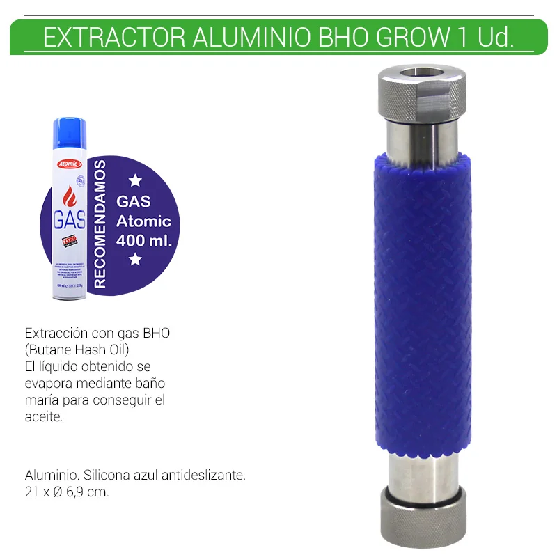 El extractor Atomic de aluminio es perfecto para sacar el mejor aceite de plantas (BHO). Es un sencillo tubo con un tamiz, por el tubo se hace circular el gas el cual desprenderá los tricomas de la materia vegetal que previamente se han colocado en su interior. Es recomendable para una perfecta extracción que la materia vegetal este muy fría. Coloca la materia prima que vayas a utilizar unas pocas horas antes en el congelador. Después solo has de colocar tus flores en el interior, roscar y cerrar el extremo con el tapón. Seguidamente inyectaremos el gas a través del orificio del mismo tapón. Una vez inyectemos el gas al extractor empezara a caer gotas de aceite por la parte inferior del extractor. Se recomienda poner un recipiente para recoger el aceite como, por ejemplo: las bandejas de silicona, vidrio tipo pírex o borosilicato. Medidas: 21 cm de largo x 6,9 cm de diámetro. COD. ART. GROACC2050