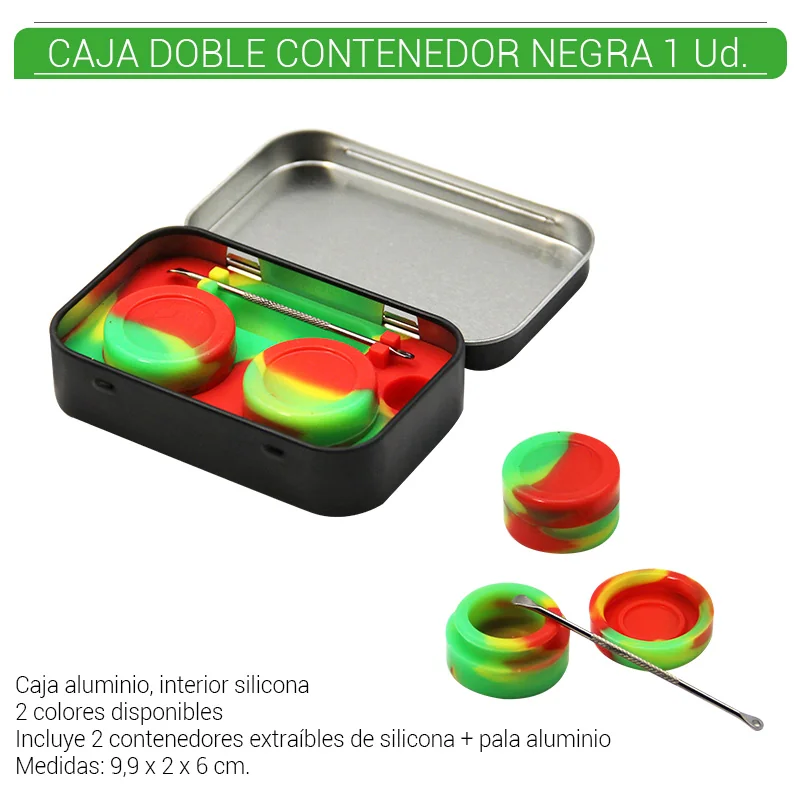 Caja de aluminio con el interior de silicona. Contiene 2 contenedores extraibles de silicona y una pala de aluminio. Medidas: 9,9 x 2 x 6 cm. COD. ART. GROACC2200