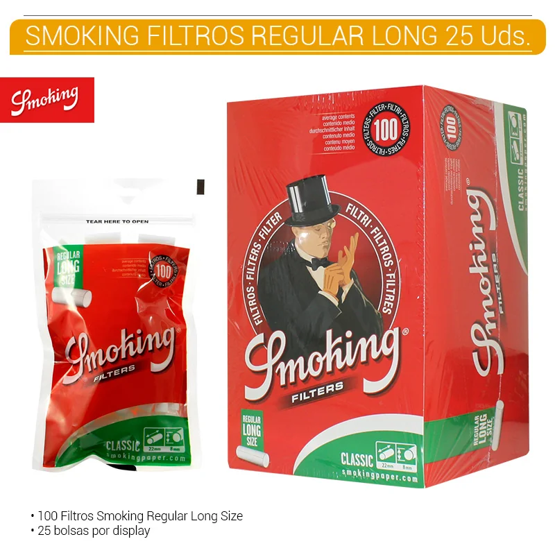 ¿Buscas filtros más largos que los convencionales? Los filtros Regular Long de Smoking® tienen el mismo diámetro que los cigarrillos estándar (8 mm), pero son algo más largos (22 mm). Los filtros de este formato tienen un mayor filtrado y, además, te ofrecen un ahorro de tabaco por cada cigarrillo que te lias. En cada bolsa cuentas con 100 filtros Regular Long, listos para usar en tus cigarrillos. Cada caja contiene 25 unidades. Usar boquillas para tabaco de liar mejora muchísimo la experiencia del fumador. Facilitan el manipulado del papel de liar tabaco, homogenizan la quema del cigarro, nos evitan ciertas sustancias perjudiciales y además proporcionan un agarre mucho más firme para nuestros labios. Por no hablar de que, gracias a la superficie que ocupan, nos permiten fumarnos hasta la última calada sin quemarnos. COD. ART. SMKCOM3215
