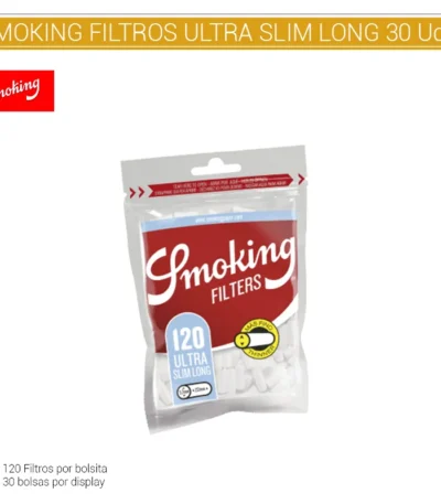 Los filtros Smoking más novedoso. Mayor longitud y filtrado. Aprovecha hasta la última calada. Los filtros Slim Long 120 de Smoking® presentan un diámetro más estrecho que el estándar con 6 mm y tienen una longitud mayor de 22 mm. Así te ofrecen un mayor filtrado que el resto de filtros de la gama y un ahorro de tabaco en cada cigarro que te lias. En este pack cuentas con 120 filtros Slim Long recubiertos de papel y listos para usar en tus cigarrillos. Usar boquillas para tabaco de liar mejora muchísimo la experiencia del fumador. Facilitan el manipulado del papel de liar tabaco, homogenizan la quema del cigarro, nos evitan ciertas sustancias perjudiciales y además proporcionan un agarre mucho más firme para nuestros labios. Por no hablar de que, gracias a la superficie que ocupan, nos permiten fumarnos hasta la última calada sin quemarnos. Cada caja contiene 30 unidades. COD. ART. SMKCOM3115