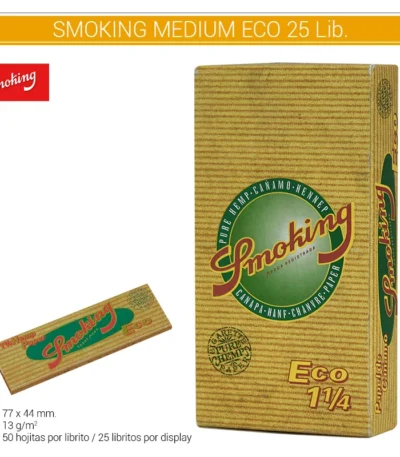 Smoking salta al mercado intentando contentar a los amantes de los sabores naturales. El papel Smoking ECO 1.1/4, de tamaño regular, está fabricado integramente en papel de cáñamo, sin blanquear ni utilizar procesos químicos de ningun típo. Cada display contiene 25 libritos. COD. ART. SMKLIB3020