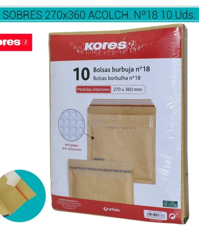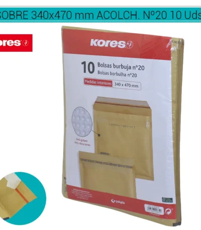 Sobres KORES Acolchados Kraft Nº20, dimensiones 350 x 470 mm, en un paquete de 10 unidades. Fabricados con material kraft acolchado para una protección excepcional durante el transporte. Ideales para envíos de artículos grandes y frágiles. Adecuados para uso comercial y postal. COD. ART. PAPSOB2020