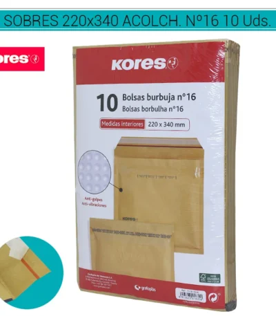 Sobres Acolchados Kraft Nº16, dimensiones 220 x 340 mm, en un paquete de 10 unidades. Fabricados con material kraft acolchado para una protección confiable de documentos y artículos frágiles. Ideales para envíos postales y comerciales. COD. ART. PAPSOB2016