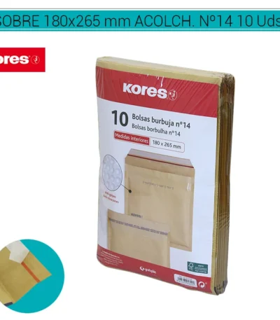 Sobres KORES Acolchados Kraft Nº14, tamaño 180 x 265 mm, en un paquete de 10 unidades. Fabricados con material kraft acolchado para una protección extra durante el envío. Ideales para artículos delicados y documentos importantes. Adecuados para envíos postales y comerciales. COD. ART. PAPSOB2014
