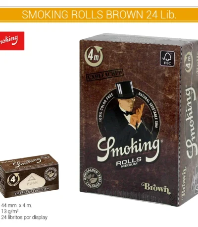 ¡Prepárate tus cigarrillos como tú prefieras con la caja Deluxe Rolls! Aquí tienes un rollo de 4 m de hoja estándar con relieve Smoking®. Está elaborado con 13 g/m2 para una máxima transparencia y alta resistencia al desgarro, además de baja combustión. La opción perfecta para liar tus cigarros como desees, además de tener también goma arábiga 100% vegetal pura, sin colorantes ni otros aditivos. El papel cuenta con certificación FSC® por proceder de plantaciones que preservan la Biodiversidad. Cada display contiene 24 rolls. COD. ART. SMKLIB6000