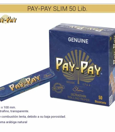 El más largo de los PAY-PAY. El librito Slim, o “L” como se denomina en España, es el mayor de los PAY-PAY, ideal para compartir. Papel tipo B Ultrafino y resistente. De combustión lenta, debido a su baja porosidad. Se apaga si no lo fumamos. Como en todos los libritos de PAY-PAY, la goma es arábiga natural, procedente de resina de acacia. Caja de 50 libritos con 32 hojas. COD. ART. PAYLIB4000